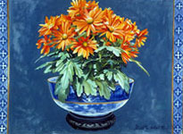 This page has thumbnail images of flowers, natural and potted. Included are hibiscus, tulips,three different images of hybrid tea roses, cyclamen, godetia, mallow, chrysanthemum and a minton jardinière, begonias and others, with associated insect life. Click on any individual thumbnail to go to its blow up page. You then have the option to buy limited edition giclée prints of that image on either canvas or paper..